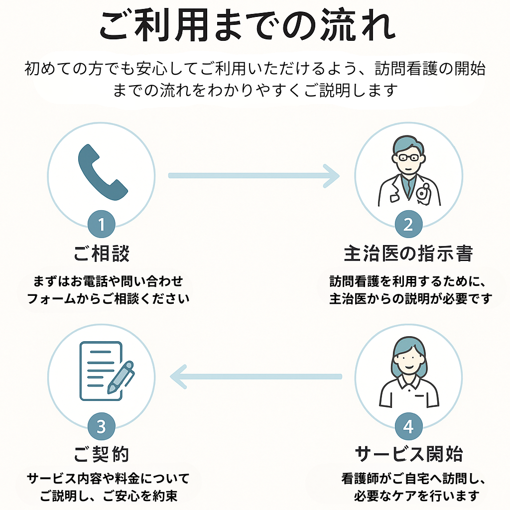 おりづる訪問看護ステーションでは、初めての方でも安心してご利用いただけるよう、訪問看護開始までの流れを丁寧にご案内しています。まずはお電話やお問い合わせフォームからお気軽にご相談ください。その後、主治医による訪問看護指示書をご用意いただき、サービス内容や料金についてご説明の上、ご契約を結びます。契約完了後は、経験豊富な看護師が京都市左京区を中心にご自宅へ訪問し、点滴や服薬管理、リハビリ、ターミナルケアなど必要なサポートを行います。地域に根ざした在宅医療サービスで、ご本人とご家族の安心をしっかりと支えます。